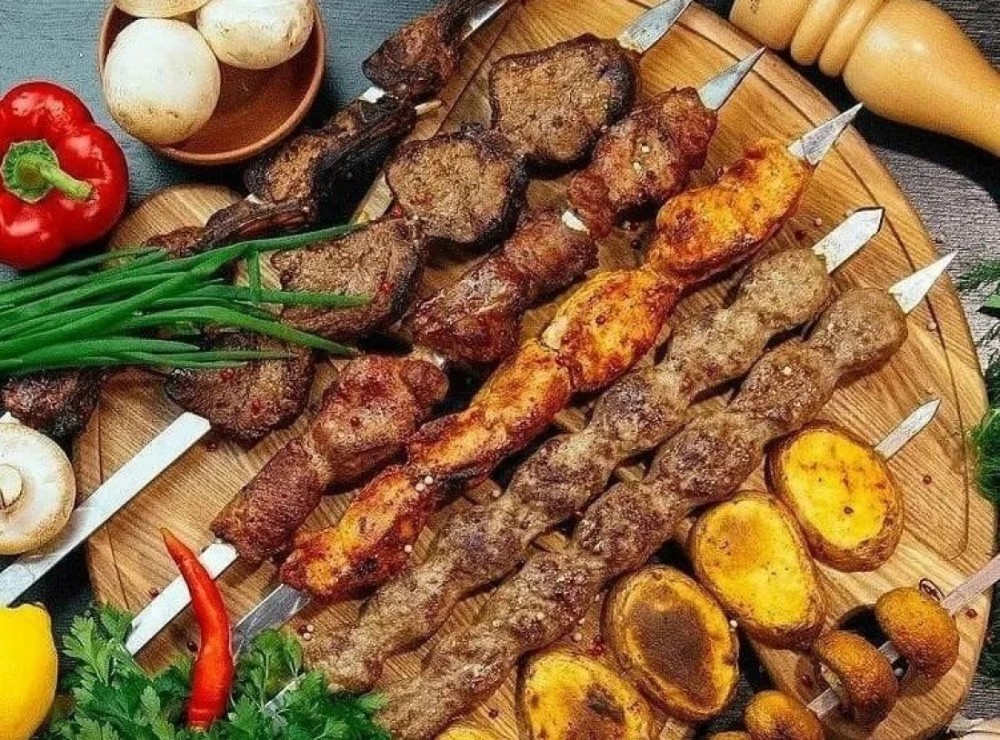 - Люля кебаб из курицы 200 гр, - Шашлык из свинины 600 гр, - Шашлык из курицы 400 гр, - Картофель печеный 250 гр, - Люля кебаб 200 гр