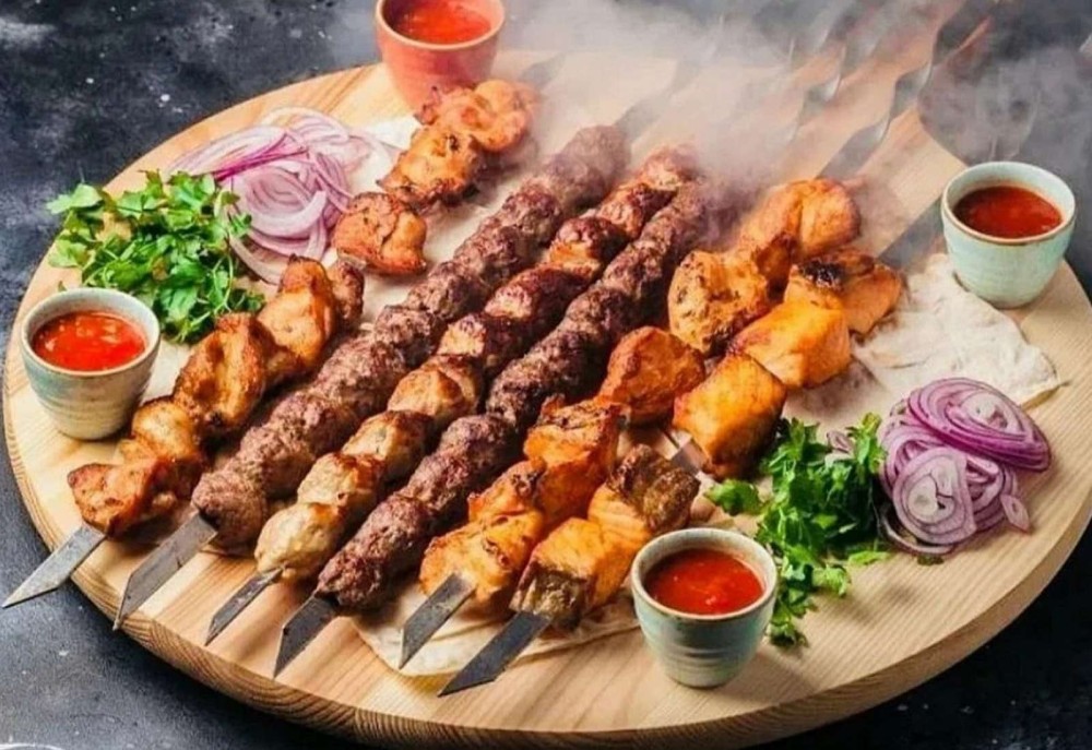 - Люля кебаб из свинины 200 гр, - Шашлык из свинины 1000 гр, - Шашлык из курицы 800 гр, - Картофель печеный 250 гр, - Люля кебаб из курицы 200 гр