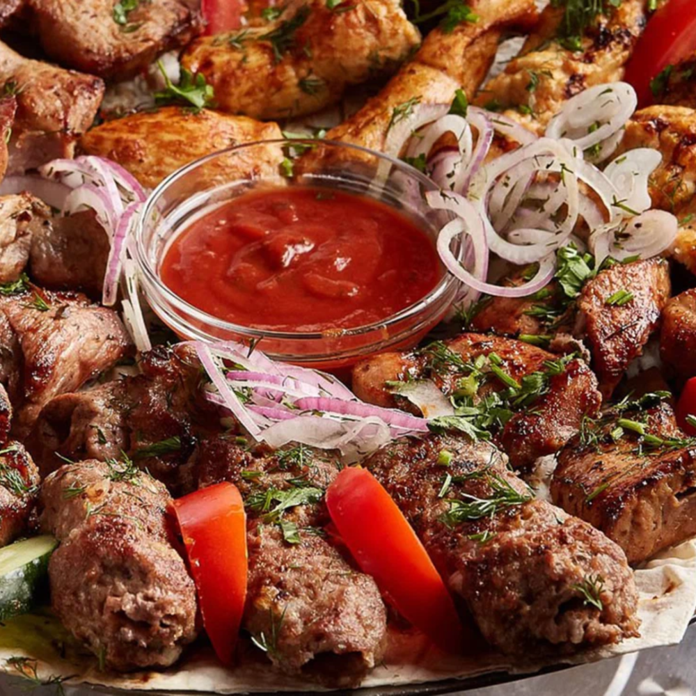 - Шашлык из свинины 600 гр, - Шашлык из куриного филе800 гр, - Люля кебаб из курицы 400 гр, - Люля кебаб из свинины 200 гр, - Грибы на мангале 200 гр, - Картошка на мангале 250 гр