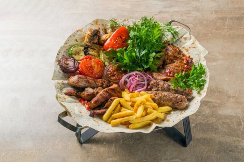 - Шашлык из свинины 200 гр, - Шашлык из курицы 200 гр, - Люля-кебаб из курицы 200 гр, - Картофель 200 гр - грибы 200 гр, - Соус Аджика 100 г