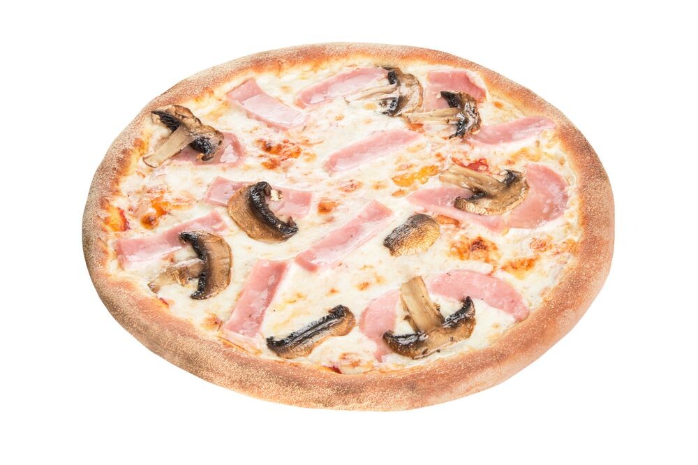 Тесто традиционное, сыр моцарелла, соус белый, ветчина, грибы