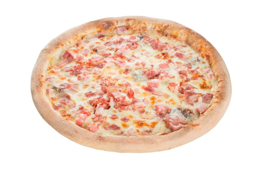 Пицца с кусочками курицы, ветчиной, беконом, моцарелла,, соус томатный