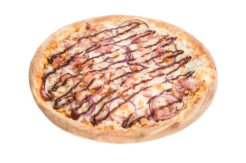 Тесто традиционное, сыр моцарелла, цыпленок , бекон, красный лук, соус барбекю, соус