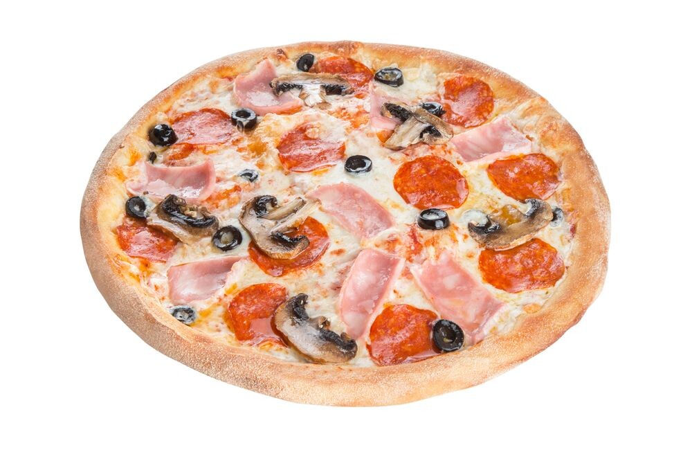 Тесто традиционное, сыр моцарелла, ветчина, пеперони, маслины, шампиньоны