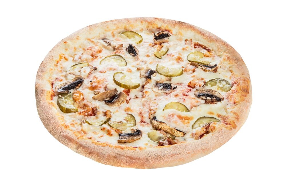 Тесто традиционное, сыр моцарелла, соус томатный, цыпленок гриль,грибы, корнишоны, лук красный